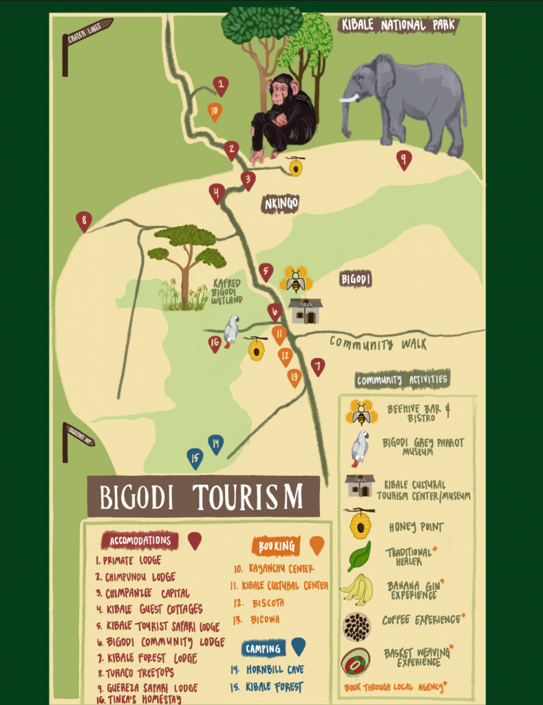 The museum is located in Bigodi, 120 meters west of the main road from Kibale National Park, next to Tinka’s Homestay.