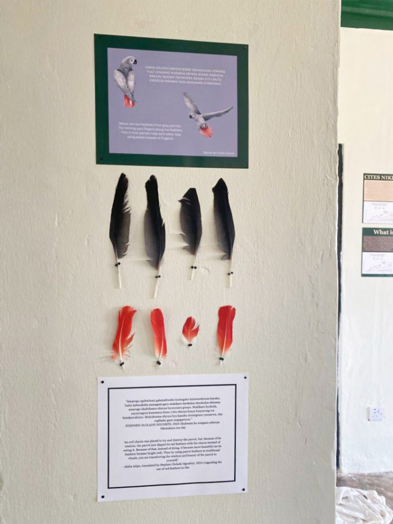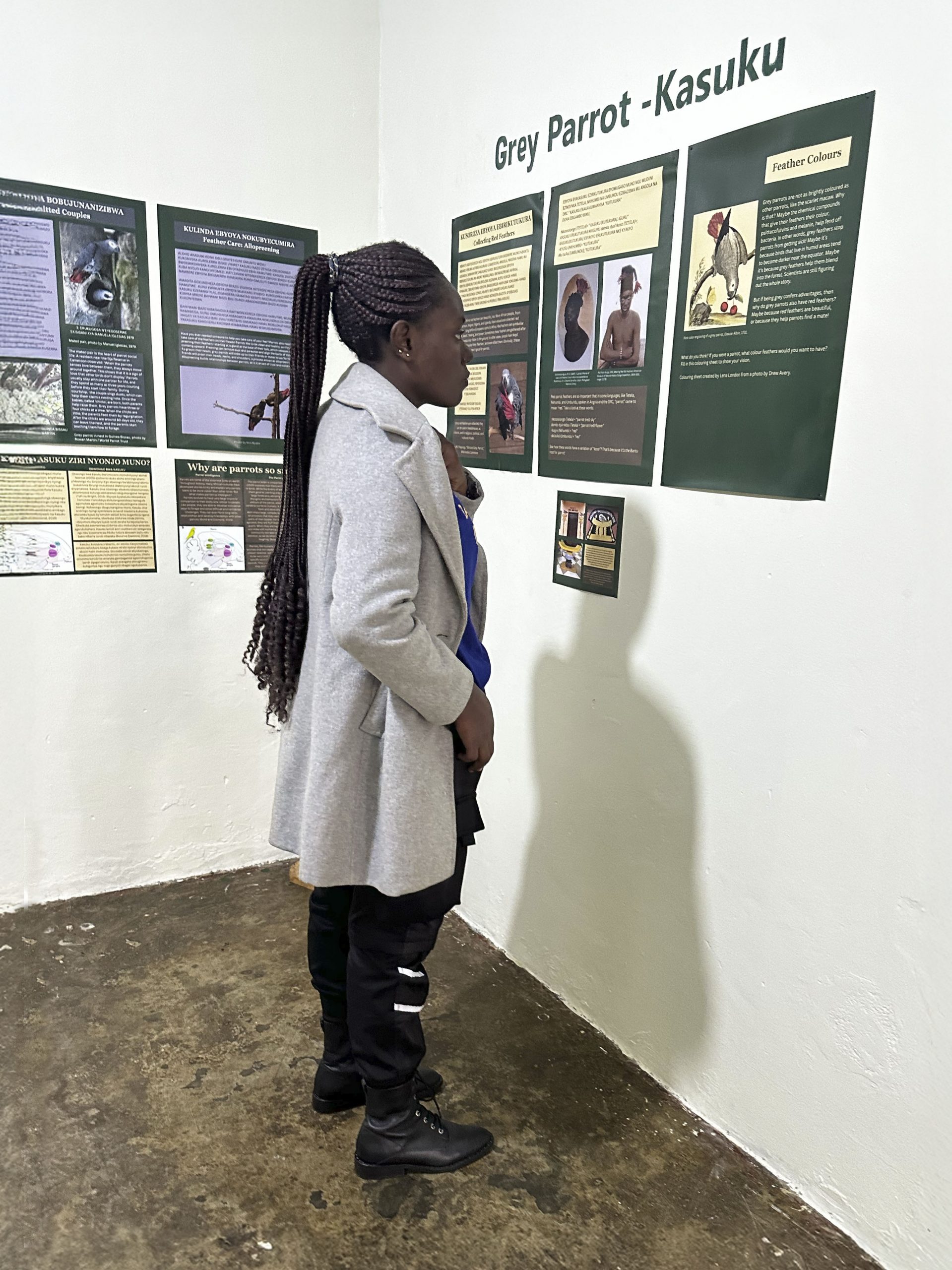 Colorful, bilingual displays in English and Rutooro guide you through five themed sections: Introduction, Endangerment, Grey Parrots, History, and Local Conservation. Exhibits explore the species’ natural history, the threats they face, and the innovative grassroots efforts emerging from Bigodi to protect them.